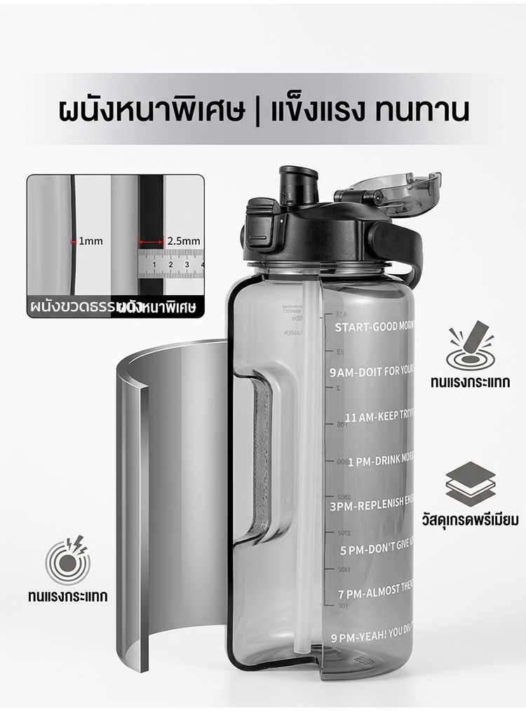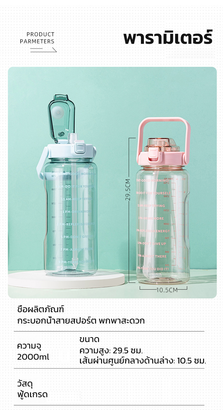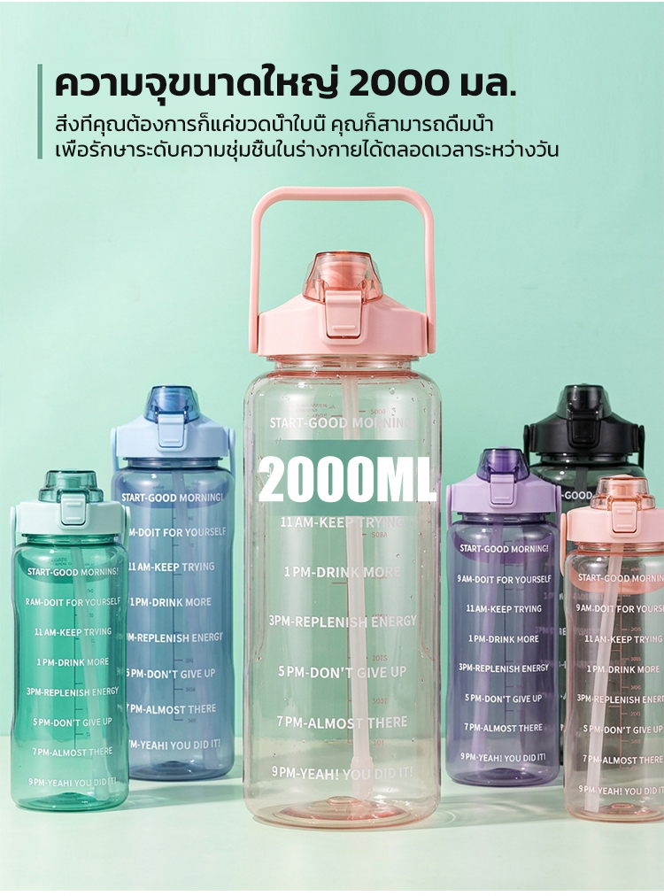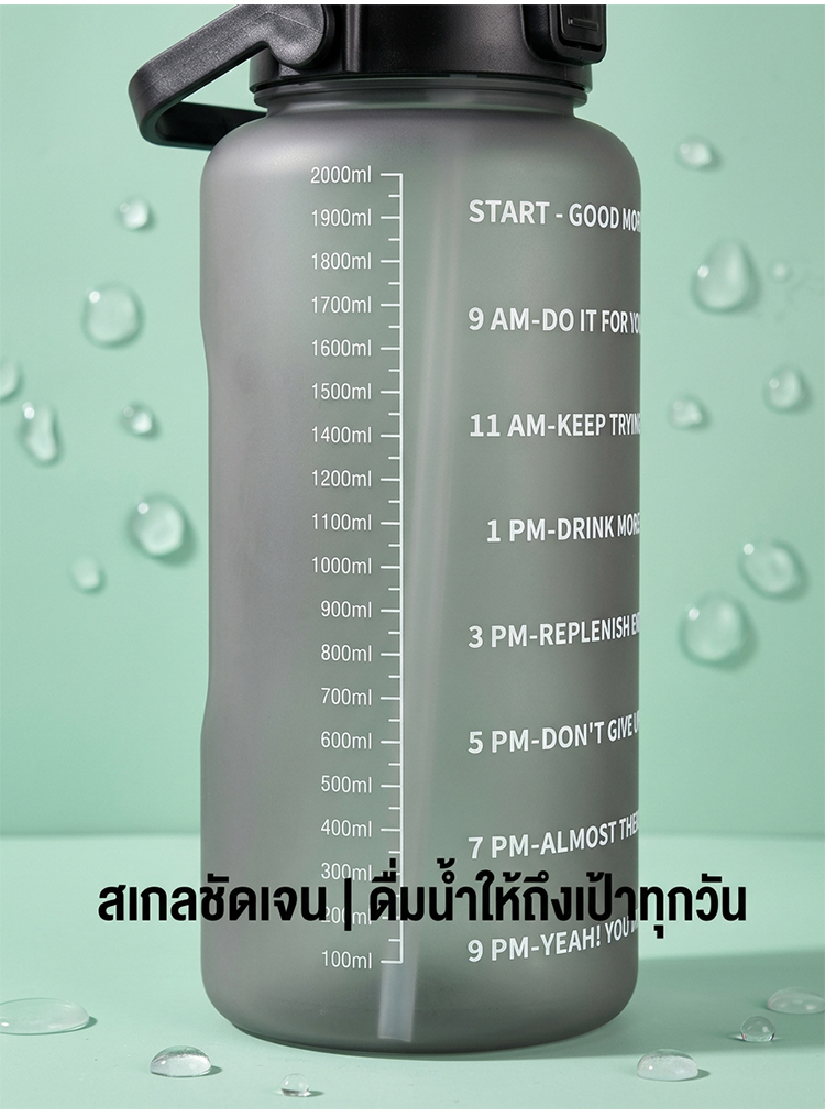 ขวดน้ำ 2 ลิตร พร้อมหลอดในตัว มีสเกลบอกเวลา ช่วยเตือนดื่มน้ำ ปลอดสาร BPA ทนทาน